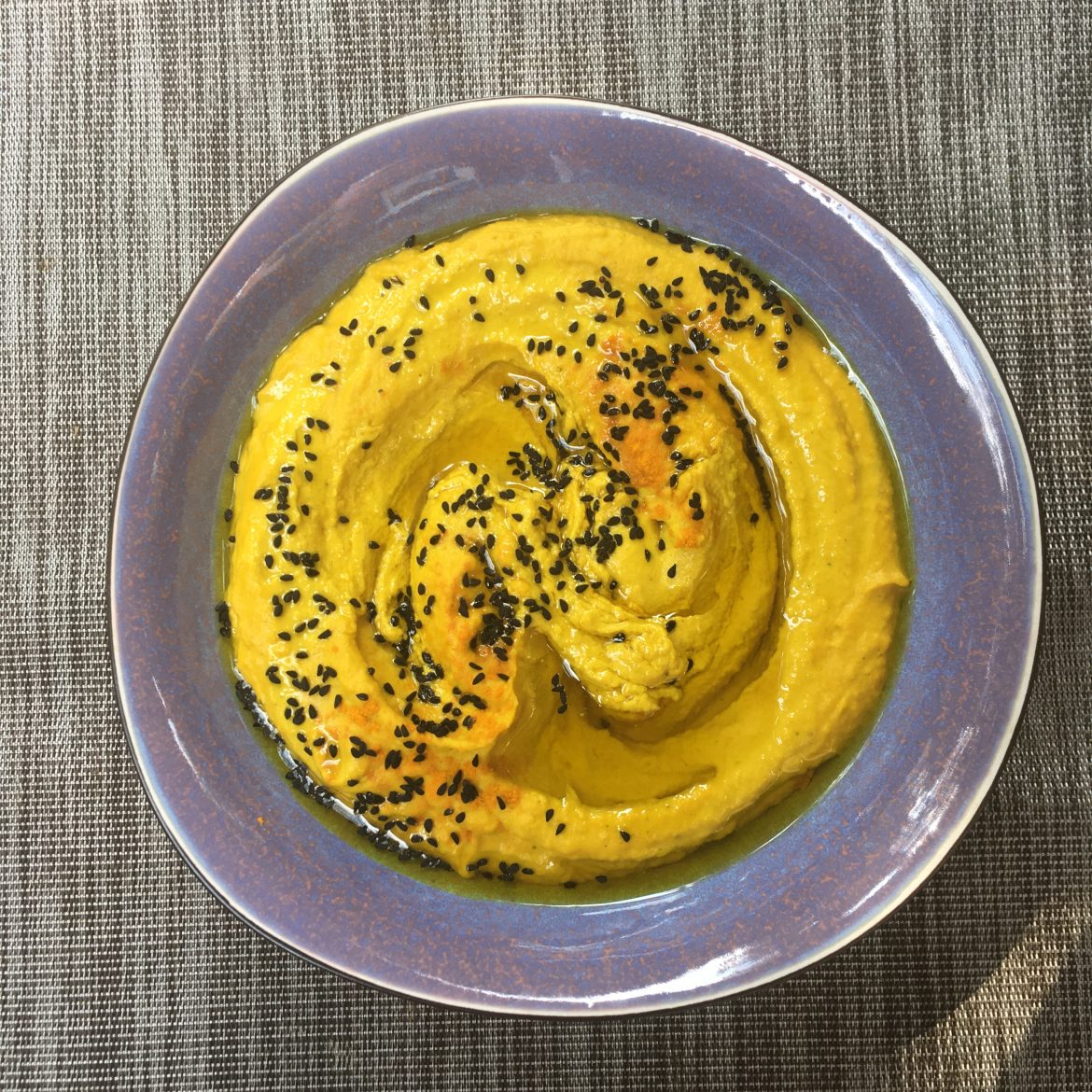Sie sollte glatt und cremig sein. In einer Schale anrichten, Olivenöl darüber träufeln und mit Kurkumapulver und/oder Schwarzkümmelsamen bestreuen. Fertig!