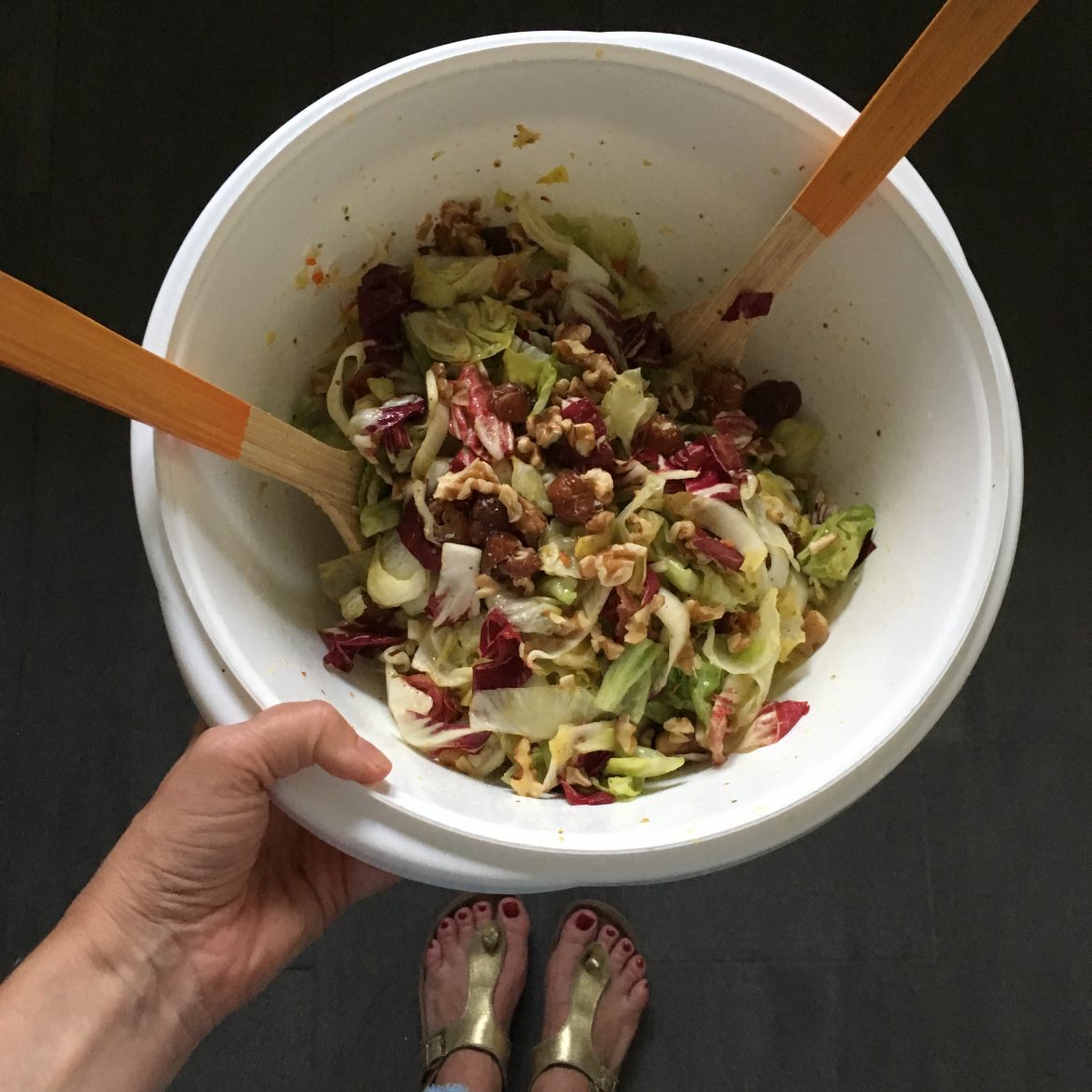 Die Mischung der Blattsalate ist sehr „bellyfriendly“ – während im Ur-Rezept nur ein bisschen Radicchio als Bitterkomponente verarbeitet war, habe ich Radicchio und Chicorée dem grünen Salat zugefügt.