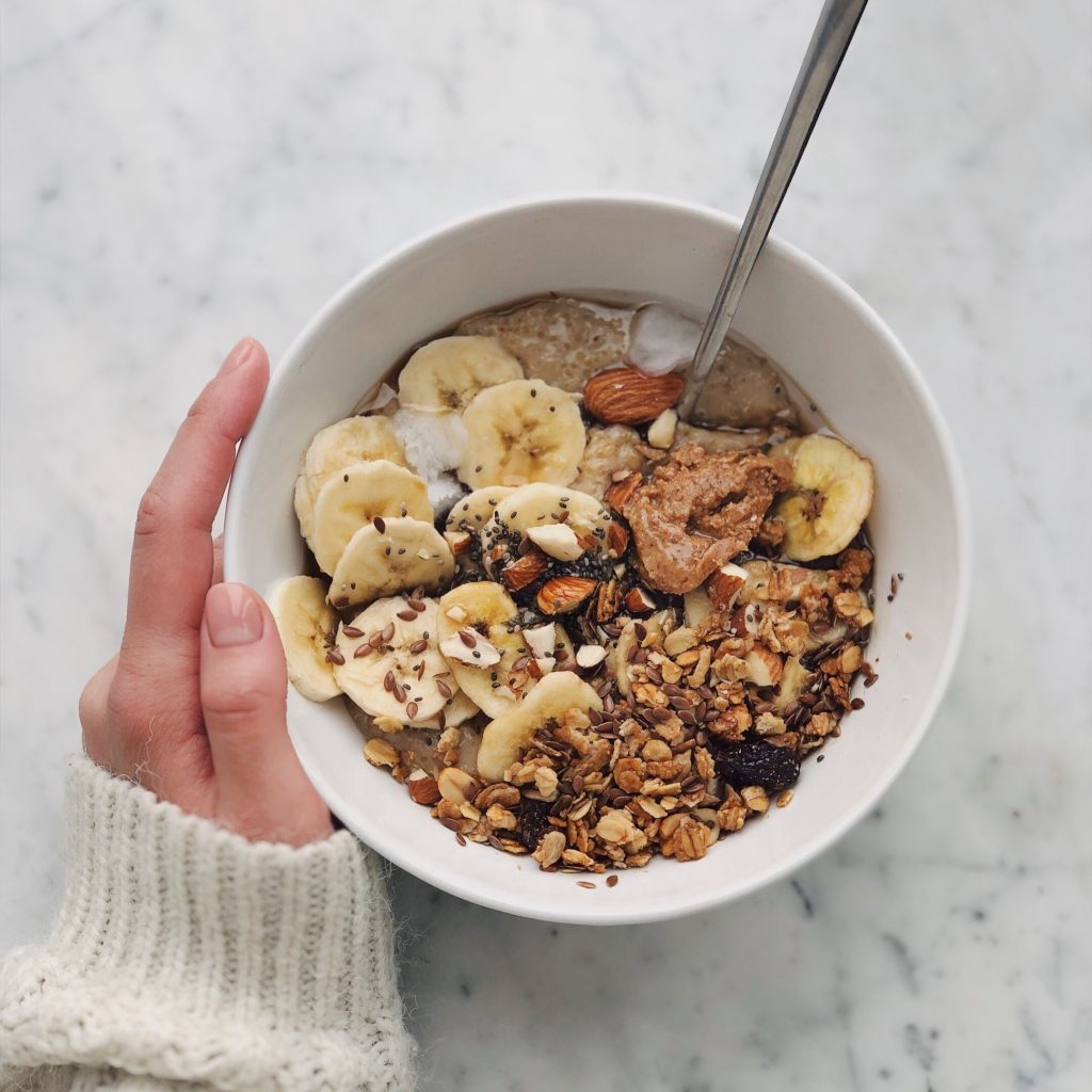 Mit einer Mischung aus Haferflocken oder -kleie, Nüssen, Kernen, Samen, Kakao und Banane kommt man also gut auf den Tagesbedarf! Ich persönlich liebe ja Porridge, wie Ihr wisst. Da kriege ich schon einiges an guten Sachen unter. Vielleicht mögt Ihr dieses hier als Basis – getoppt mit gehackten Mandeln, einer Banane und etwas Kakao?
