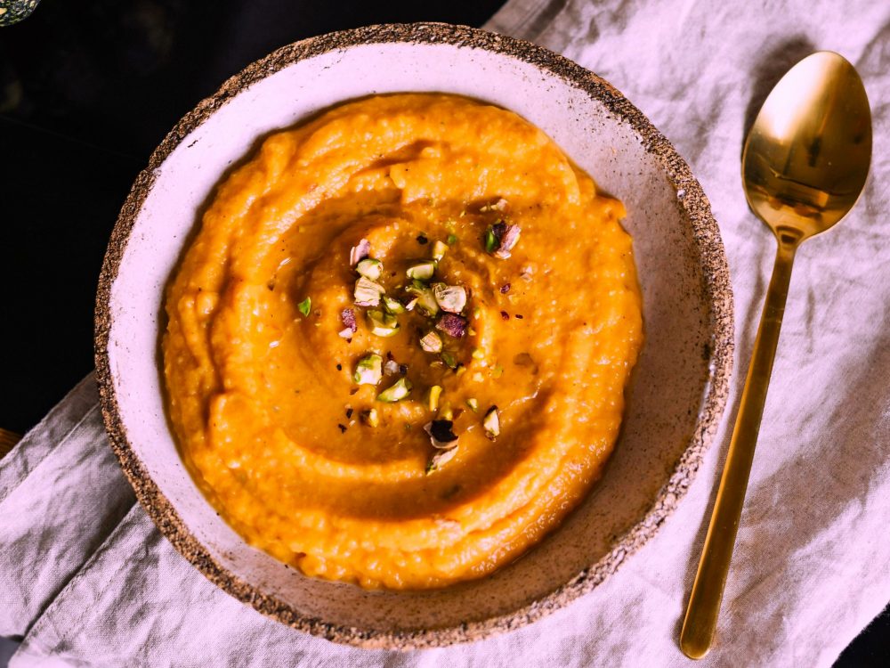 Die Kürbismischung, die Kichererbsen, den Zitronensaft, das Sesammus und 2 EL Wasser und einem Eiswürfel pürieren, mit Sesamöl, Kreuzkümmel, Koriander, Salz und Pfeffer abschmecken und optional mit gehackten Pistazien bestreuen.