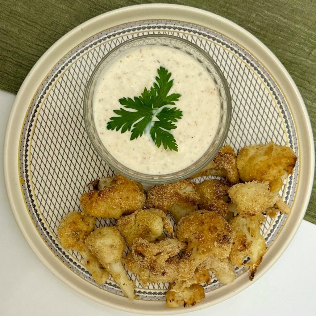 - Der Dip passt übrigens hervorragend zu geröstetem Blumenkohl – alternativ zu meinem Green Tahini Dip oder einem Kräuter-Joghurt-Dip 🙂